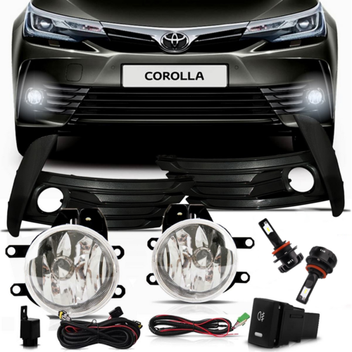 Compatível com:- Corolla 2017 até 2019Especificações Técnicas- Lente Lisa em Plástico Reforçado- Encaixe de Lâmpadas - Regulagem de Foco Manual- Encaixe Perfeito- Excelente Acabamento- Possui BotãoConteúdo da embalagem:- 02 Faróis de Neblina- 02 Grade Preta- 01 Chicote Elétrico- 01 Botão- 01 Relê AuxiliarNão se aventure, procure um profissional habilitado para fazer a sua instalação