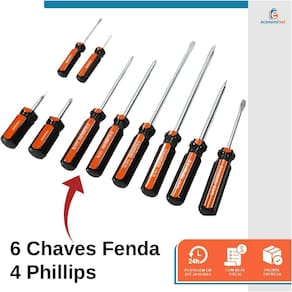 CARACTERÍSTICAS TÉCNICAS FENDA E PHILLIPS: Material: Aço Carbono Material do cabo: PVC Tipo de chave: Fenda e Phillips Quantidade do jogo: 10 peças Marca: Starfer Ref.: 3480216
