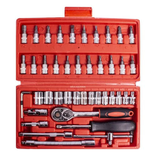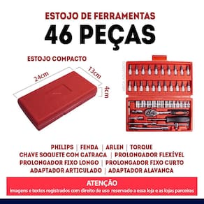 O conjunto inclui uma variedade de chaves, como chaves Philips, de fenda, Allen hexagonais e Tork estrela , além de uma chave soquete com catraca, prolongadores flexíveis e fixos, adaptadores articulados e alavancas.