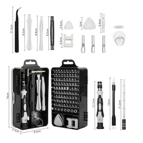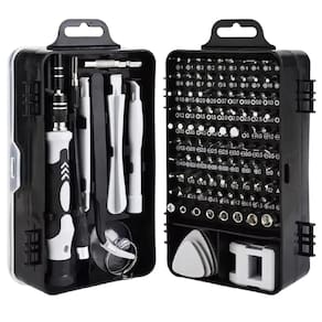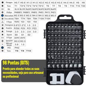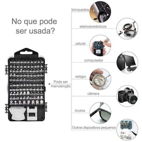 Kit / Conjunto de chaves de alta precisão, ferramentas projetadas especialmente para reparos em pequenos aparelhos celulares, consoles, computadores, relógios, óculos, câmeras, filmadoras, brinquedos entre outros eletrônicos e pequenos objetos.Feita em material de alta resistência e qualidade para melhor duração do seu produto, possui uma ampla quantidade de pontas (bits) variadas, para sanar todas as suas necessidades, acompanha uma caixa organizadora para melhor armazenamento do seu produto e aumentar a durabilidade do mesmo.O kit para reparos é equipado com uma caixa de armazenamento feito em material pp, possui magnetizador que ajuda muito durante o uso de seu produto, facilitando ainda mais o seu manuseio com pequenos parafusos.Conteúdo do kit:1 x eixo de extensão flexível1 x barra de extensão 128mm1 x pinça 122mm3 x ferramentas de alavanca de plástico (86mm e 82mm)1 x ferramentas de remoção de cartão sim 33mm1 x chave 98mm1 x ventosa 35mm1 x bloco magnetizador/desmagnetizador1 x agulha para remoção cartão sim3 x palhetas de abertura (35*37mm e 31*33mm)1 x suporte de broca para chave de fenda elétrica1 x adaptador sleeve98 * bits de chaves (veja abaixo quais)especificações das chaves:Chave Torx: T2, T3, T4, T5, T5Chave Pentalobe: 0.8, 1.2, 1.5, 2.0Chave Tri wing: 0.6, 2, 2.5, 3Chave Phillips: 0, PH0, PH1, PH1, PH2,Chave Spanner: U2.6, U3.0Chave Fenda Simples: 1.0, 1.5, 2.0, 2.5, 3.0, 3.5, 4.0,Chave Torx 2: T1, T6, T7, T8, T9, T10, T15, T20Chave torx com furo: T6H, T7H, T8, T9, T10, T15, T20,Chave Allen: 0.7, 0.9, 1.3, 1.5, 2.0, 2.5, 3.0, 3.5, 4.0, 4.5, 5, 6Chave Triangular: 2.0, 2.3, 2.6, 3.0Chave Pozidriv: 00, PZ0, PZ1, PZ2,Chave: 2.0, 2.5Chave Robertson: V51, V50, V52Chave Pino Agulha: 0.8, 1.0Soquete Phillips: 2.0Soquete Sextavado: 2.5, 3.0, 3.5, 4, 4.5, 5.0, 5.5