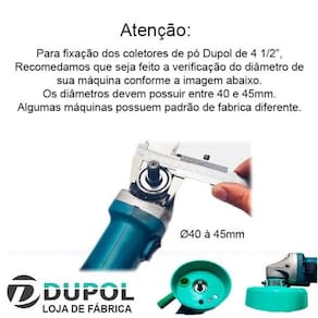 Para fixação dos Coletores de Pó Dupol 4 1/2", recomendamos que seja feita a verificação do diâmetro de encaixe de sua lixadeira/esmerilhadeira conforme a imagem deste anúncio.