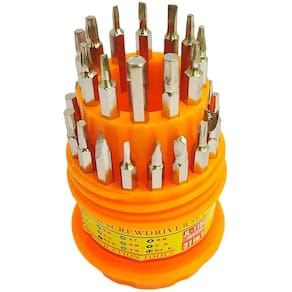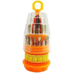 Jogo de chave 31 em 1 portátil que é ideal para pequenos reparos. São 31 tipos diferentes de chaves removíveis feitas com aço inox para serem duráveis, o cabo é emborrachado para evitar choques em itens eletrônicos e acompanha um estojo para manter tudo organizado