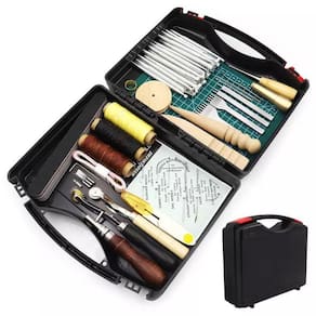 Pacote inclui:5 x lixas1 x Tesoura1 x Furador costurador cobre1 x Furador De Madeira1 x Faca giratória esculpir1 x Fita Métrica1 x Groover 5x1 Ajustável2 x Madeira brunidor1 x roda de brunir3 x fios encerados (55 jardas)4 x punch [garfos] (1/2/4/6)7 x agulha de costura de couro (7 tamanhos)20 x conjunto de ferramentas selos de estampagem de couro2 x Carretilha marcador pontilhado1 x Agulhão cabo madeira1 X Maleta plástica preta
