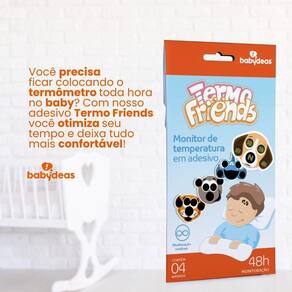 Super prático e a ajuda que toda mãe precisa para monitorar a febre dos bebês e crianças. Termo Friends acompanha a temperatura por até 48 horas contínuas. Para começar o monitoramento, basta colar o adesivo de Termo Friends na testa do bebê ou criança e pronto. Em poucos segundos o Termo Friends começa a mostrar a temperatura em tempo real. A indicação de temperatura mostrada por Termo Friends tem variação de 1 grau entre uma e outra, assim, caso a temperatura esteja em 37,6, por exemplo, Termo Friends vai acender o 37 e o 38, indicando que a temperatura está subindo. Seguro para a pele dos pequenos, pois a cola de Termo Friends é a base dágua.