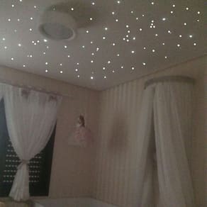 O Kit De Iluminação Noite Estrelada Fibra Ótica conta com 150 estrelas de fibra otica para o efeito estrelado. Muito utilizado na arquitetura e paisagismo como iluminação decorativa, deve ser aplicado em forros e painéis de gesso, madeira ou qualquer outra superfície de fácil furação. Ótima ideia para decorar o quarto infantil, do casal, salas de banho, home theater, spa, entre outros. O conjunto Noite Estrelada conta com fonte de luz Led com filtro interno para melhor contraste, resultando em uma perfeita nitidez da cor. Equipamento totalmente confeccionado em alumínio e tomada de alimentação com plug ac proporcionando uma melhor segurança e proteção de sua instalação. Possui encaixe perfeito para receber o conjunto de fibras óticas e funcionamento Bivolt. Qual o diferencial deste kit As fibras de diferentes calibres fornecidos neste kit simularão algumas estrelas maiores e menores, lindo efeito estrelado mais real de uma perfeita noite estrelada, os terminais estrela que acompanham o kit farão o efeito de estrelas maiores. Características: - 150 pontos de luz, sendo : 50 cabos de 1m e 100 cabos de 2m - Equipamento iluminador profissional no kit - Fibras óticas super flexíveis e perfeita definição de pontos luz - Broca produzida em aço rápido permite fácil perfuração - Produto da maior empresa especialista em noite estrelada do Brasil Especificações técnicas Marca: noite estrelada / inovva iluminação interiores Quantidade: 150 pontos de luz - estrelas Cor: branco frio Iluminador super led Voltagem: bivolt Potencia: 5w - novo chip cree led Dimensões aproximadas do equipamento lxaxc : 7 x 6 x 8 cm Área indicada: 3 a 4 m Itens inclusos 01 equipamento iluminador compacto em alumínio com plug tomada ac, 01 conjunto com cabos de fibra ótica com fibras 50 cabos de 1m/100 cabos de 2m 5 Estrelas maiores de 5mm de diâmetro 01 broca de 0.8 mm, 01 tubo de cola, 01 manual de instalação completo 01 certificado de do fabricante. : 1 ano no equipamento e 12 anos no cabeamento Instalação - Infra Estrutura Necessária Para a instalação é necessário um ponto de energia rebaixo gesso/madeira/pvc e um vão livre de pelo menos 12cm, por trás da superfície que deve estar com pintura/acabamento final pronto. Sobre a Inovva Interiores A Inovva é especializada em iluminação com fibra ótica e led. Com a missão de disponibilizar aos clientes o que há de melhor e mais moderno no segmento, a Inovva está sempre aprimorando seus produtos para tornar a tecnologia acessível a todos. Os kits para efeito e simulação estrelado são confeccionados com as melhores matérias-primas do mercado. Para acessar todos nosso produtos com a qualidade inovva - na busca digite - noite estrelada fibra otica