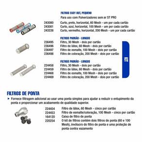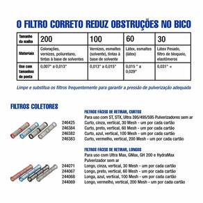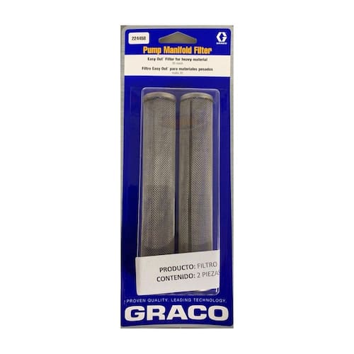 Usar um filtro de coletor de bomba padrão é a maneira mais fácil de maximizar o desempenho do spray, economizando tempo e dinheiro ao estender a vida útil do seu equipamento e reduzir o tempo de inatividade. Use malha 60 para materiais como primer de látex, tintas de látex e esmaltes de látex. 2 und