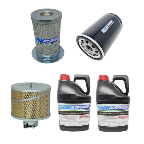 Kit de Filtros e 10L de Óleo Lubrificante Similares para Compressor Rotativo de Parafuso Techto Platinum TB 7,5. O kit contém: