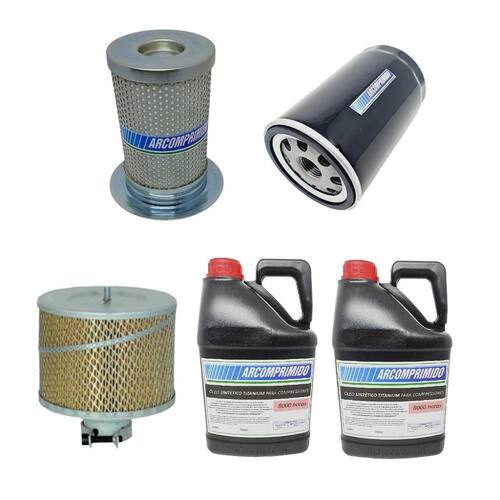 Kit de Filtros e 10L de Óleo Lubrificante Similares para Compressor Rotativo de Parafuso Techto Supreme SC 10hp. O kit contém: