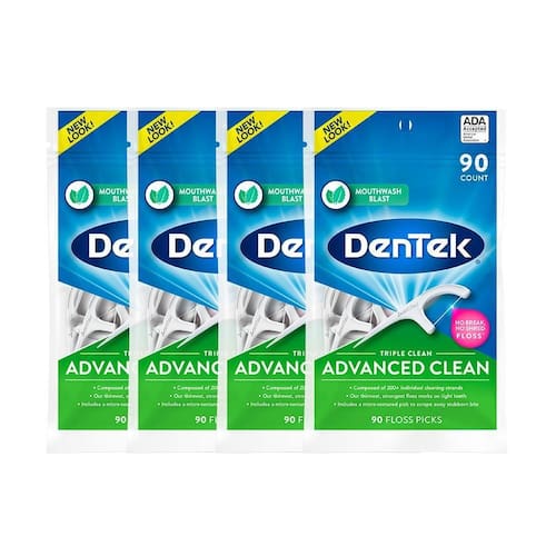 - Kit Contém: 4 pacotes de Fio Dental Dentek Floss Picks Triple Clean Advanced Clean 90 unidades cada