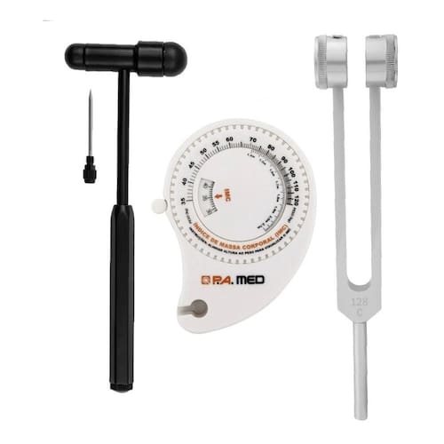 INCLUSO NO KIT 1- Martelo ( Modelo a ser Escolhido ) 1- Diapasão 128 HZ 1- Trena PAMED 150 CM O Martelo BUCK, TAYLOR Ou BAMBINSK para reflexos neurológico é indicado para uso em procedimentos ambulatoriais como também, para aferir sensibilidade e reflexos neurológicos. Os martelos de percussão neural são indicado para induzir a resposta miotática, plantar e cutânea, nos exames de rotina para avaliação dos reflexos do paciente. Martelo para Reflexos Neurológicos BIC; Cabeça com pontas de PVC ; Examinador de reflexo; Confeccionado em metal; Não Estéril e Reutilizável; Qualidade e confiança BIC. Material do Cabo: Metal cromado Material Cabeça: PVC Sintético Instruções de Uso: Deve ser utilizado de acordo com a técnica adotada pelo profissional de saúde. Advertências e Precauções: Não deixar o martelo em superfície molhada ou excesso de calor / Deve ser utilizado por profissional habilitado / Manter o instrumento longe do alcance de crianças. Garantia: 1 ano garantia contra defeito de fabricação Marca: BIC Bem Estar Cadastro na ANVISA: 81535970006 O Diapasão médico STARK BIC 128 CPS com fixador é um instrumento utilizado por profissionais da saúde na avaliação e testes audiológicos na verificação de perda auditiva. O diapasão serve como fonte condutora para a transmissão dos sons por via aérea e via óssea e pode ajudar a direcionar o diagnostico nos casos de lesão do sistema auditivo, tanto relativo ao local quanto à causa da lesão. DIAPASÃO 128 HZ Modelo: 128HZ Material: Alumínio Comprimento Total: 216mm Largura Total: 41mm Garantia: 1 ano contra defeito de fabricação Marca: BIC Cadastro na ANVISA: 81535970007 FITA ANTROPOMÉTRICA – P.A. MED vai te ajudar a medir com precisão as circunferências. Também é utilizada para medir os índices de cintura quadril e massa corpórea. As medidas antropométricas são usadas para avaliar o tamanho, forma e composição do corpo humano. Refere-se ao estudo quantitativo das características físicas e serve como uma ferramenta fundamental para determinar objetivamente as mudanças na composição corporal. ESPECIFICAÇÕES TÉCNICAS FITA ANTROPOMÉTRICA Amplitude de Medição: 0 a 150cm (1,5 metros) Resolução da Escala: Milímetros Material: Caixa plástica contendo uma trena de fita de fibra de vidro inelástica e maleável. Medida: 7,5cm (comprimento) x 7,5cm (Altura) x 2,8cm (Largura) Peso: 50gr Indicação de Uso / Finalidade: Utilizada para verificação de perímetros e circunferências corporais de indivíduo de qualquer faixa etária. Modo de Usar: Conforme Técnica do usuário. Advertências e Precauções: Evitar quedas e batidas. Condições de Armazenamento: Armazenar em local seco e arejado. Contém na Embalagem: 01 Fita Antropométrica. Validade: Indeterminada. Garantia: 90 Dias contra defeito de fabricação. Cadastro da ANVISA: Isento