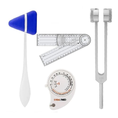 INCLUSO NO KIT   1- Martelo ( Modelo a ser Escolhido ) 1- Diapasão 128 HZ 1- Trena PAMED 150 CM 1- Goniometro 36 cm em PVC     O Martelo BUCK, TAYLOR Ou BAMBINSK para reflexos neurológico é indicado para uso em procedimentos ambulatoriais como também, para aferir sensibilidade e reflexos neurológicos. Os martelos de percussão neural são indicado para induzir a resposta miotática, plantar e cutânea, nos exames de rotina para avaliação dos reflexos do paciente.   Martelo para Reflexos Neurológicos BIC; Cabeça com pontas de PVC ; Examinador de reflexo; Confeccionado em metal; Não Estéril e Reutilizável; Qualidade e confiança BIC.   Material do Cabo: Metal cromado Material Cabeça: PVC Sintético Instruções de Uso: Deve ser utilizado de acordo com a técnica adotada pelo profissional de saúde. Advertências e Precauções: Não deixar o martelo em superfície molhada ou excesso de calor / Deve ser utilizado por profissional habilitado / Manter o instrumento longe do alcance de crianças. Garantia: 1 ano garantia contra defeito de fabricação Marca: BIC Bem Estar Cadastro na ANVISA: 81535970006   O Diapasão médico STARK BIC 128 CPS com fixador é um instrumento utilizado por profissionais da saúde na avaliação e testes audiológicos na verificação de perda auditiva. O diapasão serve como fonte condutora para a transmissão dos sons por via aérea e via óssea e pode ajudar a direcionar o diagnostico nos casos de lesão do sistema auditivo, tanto relativo ao local quanto à causa da lesão. DIAPASÃO 128 HZ Modelo: 128HZ Material: Alumínio Comprimento Total: 216mm Largura Total: 41mm Garantia: 1 ano contra defeito de fabricação Marca: BIC Cadastro na ANVISA: 81535970007   FITA ANTROPOMÉTRICA – P.A. MED vai te ajudar a medir com precisão as circunferências. Também é utilizada para medir os índices de cintura quadril e massa corpórea. As medidas antropométricas são usadas para avaliar o tamanho, forma e composição do corpo humano. Refere-se ao estudo quantitativo das características físicas e serve como uma ferramenta fundamental para determinar objetivamente as mudanças na composição corporal.   ESPECIFICAÇÕES TÉCNICAS   FITA ANTROPOMÉTRICA   Amplitude de Medição: 0 a 150cm (1,5 metros) Resolução da Escala: Milímetros Material: Caixa plástica contendo uma trena de fita de fibra de vidro inelástica e maleável. Medida: 7,5cm (comprimento) x 7,5cm (Altura) x 2,8cm (Largura) Peso: 50gr Indicação de Uso / Finalidade: Utilizada para verificação de perímetros e circunferências corporais de indivíduo de qualquer faixa etária. Modo de Usar: Conforme Técnica do usuário. Advertências e Precauções: Evitar quedas e batidas. Condições de Armazenamento: Armazenar em local seco e arejado. Contém na Embalagem: 01 Fita Antropométrica. Validade: Indeterminada. Garantia: 90 Dias contra defeito de fabricação. Cadastro da ANVISA: Isento   GONIOMETRO GRANDE   Goniômetro Universal em plástico transparente com 2 réguas para mensuração de amplitude articular. Sistema de transferidor de 0º a 360º . Medidas aproximadas 21,5 x 5cm (CxL).   Largura: 5 cm Profundidade: 0,75 mm Peso: 0.01Kg Comprimento: 21,5cm