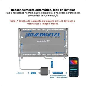 Especificações: - marca: novadigital; - modelo: clw-stv5565 ou clw-stv4050; - homologado anatel: 07871-21-11765; - wireless: wi-fi 2.4ghz; - wi-fi: ieee 802.11 b/g/n 2,4ghz; - fonte: 5 -12v dc; - potência: 18w; - nível de proteção da fita led: ip65; - tipo de hdmi compatível: hdmi 2.0b; - hdcp: 2.2; - resolução: 3840x2160/4096x216060fps; - taxa de atualização máx.: 240hz 1080p; - hdr: hdr10/hlg/ dolby vision; - tamanho da fita led: 3,8m 55-65 polegadas , 70+120+70+120cm ; - controle de brilho, cor e intensidade através do aplicativo; - dimerizável: controle através do aplicativo.