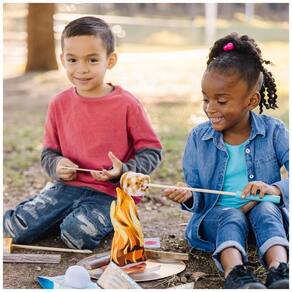 O conjunto de 23 peças Melissa Doug Lets Explore S mores More Campfire Play Set é perfeito para crianças a partir de três anos que adoram brincar ao ar livre. Com um tapete reversível para fogueira, tronco de quatro peças e chamas crepitantes, as crianças podem explorar a experiência de torrar marshmallows ao redor de uma fogueira. Além disso, o conjunto inclui dois marshmallows de pano reversíveis, dois pedaços de chocolate de madeira em uma caixa e quatro biscoitos de madeira em outra caixa, tudo para criar deliciosos costumes imaginativos. O livreto de atividades ilustrado ajuda as crianças a seguir os passos para criar seus próprios marshmallows torrados. O conjunto é armazenado em uma bolsa de malha para fácil limpeza. Lets Explore incentiva as crianças a se conectarem com o mundo natural por meio de brincadeiras imaginativas e a descobrirem a alegria das aventuras ao ar livre que inspiram curiosidade e confiança. O conjunto foi nomeado o vencedor do Top Summer Toys de 2022 do Toy Insiders e é um ótimo presente para crianças de 3 a 6 anos que querem brincar de maneira prática e sem tela.