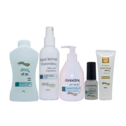 Kit para Foliculite Pelos encravados Barba , Virilha, Axilas, Nádegas Bioexotic 1 Sabonete de Clorexidine Neutro 250 ml2 Sabonete em Pó Esfoliante Físico Zinco + Vit B6 + Argila Verde 150g3 Água Termal Fitoaromática 240ml4 Sérum de Nicotinamida 50g5 Filtro Solar facial FPS 40 com Vital E 60g Modo de usar:1 Lavar a região com Sabonete de Clorexidine, Enxaguar e Secar.2 Colocar um pouco de Sabonete esfoliante em pó em uma das mãos e umedecer com Água Termal, misture até formar uma pasta . Passar na parte a ser tratada, friccionando na pele para desobstruir os Folículos. Repetir a operação várias vezes em toda a região.Retirar com água e secar.3 Aplicar o Sérum de Nicotinamida e deixar a pele absorver. Não retirar.4 Finalizar aplicando FPS 40 com Vital E . Observação: Poderá usar maquiagem sem retirar o filtro solar. Uso diário ou a critério do profissional