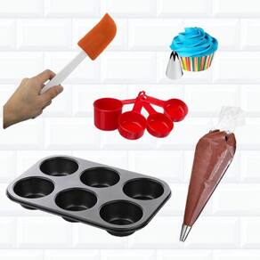 Forma bandeja cupcake 6 cavidades Manga descartável 6 unid. Bico 1m Jg medidor 4 peças Espátula silicone