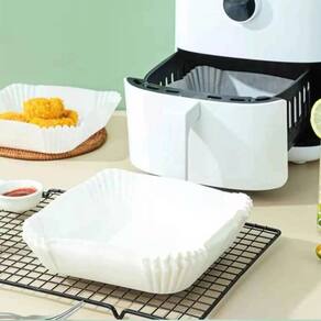 Kit com forma quadrada de silicone antiaderente (20x20x7cm, 1,5L) para air fryer, forno e micro-ondas, suporta de -40ºC a 240ºC, livre de BPA, mais 50 folhas de papel descartáveis quadradas (20cm inferior, 23cm superior, 6cm altura) para air fryer, suporta até 200ºC.Tipo