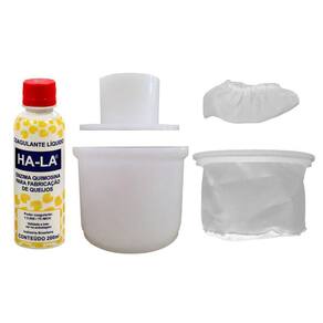 Kit Forma Redonda Perfurada para Queijo Minas Padrão Cobocó Cp-500 com Prensador + 1 Dessorador + 1 Touca + 1 Coalho Hala 200ml. Fabricadas em polietileno, são duráveis, higiênicas e apresentam um excelente acabamento, certamente lhe ajudará a produzir deliciosos queijos; Indicada para fabricação de queijos: Minas Padrão Prensado; Cobocó Paulista; Meia cura; Ricota Prensado; Minas Frescal Prensado; Parmesão; Capacidade: 400g a 700g; Medidas: 11 cm de diâmetro x 09 cm de altura; Peso: 220 g aproximadamente; Cor: Branco; Marca: Injesul; Coalho Ha-la Líquido 200ml Para Fabricação De Queijo: Especialmente desenvolvidos para elaborar queijos com excelente rendimento, com alto padrão de qualidade e eficiência na coagulação de leite, facilitam o processo produtivo garantindo um produto final seguro e com ótimos resultados. Com 7 a 9ml dos coagulantes líquidos HA-LA, é possível coagular até 10 litros de leite, o que significa que 1 frasco de 200ml coagula em média 250 litros de leite. Poder de coagulação de 1 parte de coalho para 3.000 partes de leite. Fabricante: Chr. Hansen Industria e Comércio Ltda; Conteúdo da embalagem: 1 Forma Queijo Minas Padrão Cobocó Cp-500 + 1 Prensador + 1 Dessorador + 1 Touca + 1 Coalho Hala 200ml.