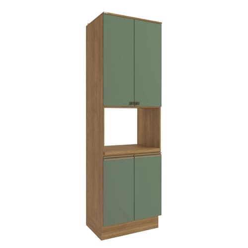 Sua cozinha com toda a beleza e praticidade do Kit Forno N729 da Cozinha Celeste da Kappesberg. Produzido em chapa MDF de 15mm, ele garante robustez, firmeza e qualidade, além de um acabamento perfeito. Com sete camadas de pintura tanto na parte interna quanto na externa, a caixaria possui pintura touch na cor nogueira, contando com a textura dos veios da madeira, enquanto que as portas, com pintura na cor verde, possuem acabamento fosco. Uma combinação marcante e moderna, que dará ainda mais destaque ao seu espaço, deixando sua cozinha perfeita. A peça ideal para quem busca por otimização de espaço, contando com quatro portas e quatro prateleiras, além de prateleira reforçada em 25mm para eletrodomésticos, como forno ou microondas. Fechando ótimas combinações com balcões e aéreos, o destaque fica para as dobradiças com amortecimento, garantindo um fechamento suave e sem ruídos, incluindo mais durabilidade. E seus puxadores metálicos na cor dourada completam o design e a qualidade da cozinha, deixando seu ambiente ainda mais estiloso. Renove seu espaço e o deixe ainda mais completo com a Cozinha Celeste da Kappesberg.