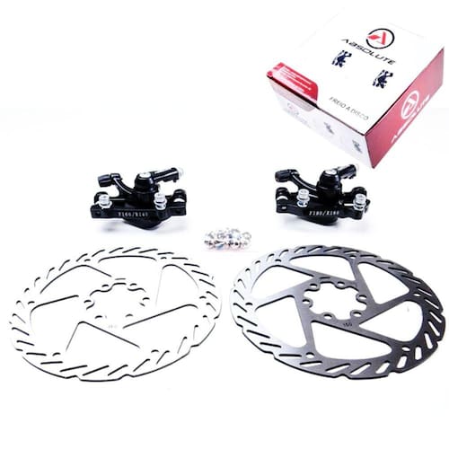Maior poder de frenagem com baixo custo, leve e resistente... O Freio a disco Absolute possui acionamento por cabos de aço (mecânico), oferece ótimo poder de frenagem, acompanha par de discos (rotores) de 160mm, e pinças completas em alumínio com pastilhas já inclusas, formando um kit leve e resistente. Principais Características - Produto NOVO e na CAIXA - Marca: Absolute - Pinças / Caliper / Burrinho Completo em alumínio e com pastilhas já inclusas - Discos (rotores) de 160mm com 6 Furos - Peso aproximado 380g Componentes - 2x Pinças de Freio Mecânico Absolute com pastilhas - 2x Discos (rotores) de 160mm com 6 furos - 12 Parafusos de fixação dos discos (rotores) - 04 Parafusos de fixação das pinças Não acompanha cubos