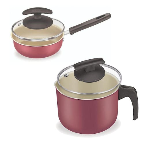 Kit Frigideira Baby + Caneca Leiteira Antiaderentes Cereja Cor: Cereja Não perca a oportunidade de adquirir nosso incrível kit de frigideira baby de 12cm e caneca leiteira de 14cm com tampa de vidro temperado e antiaderente As frigideiras são ideais para preparar alimentos em porções menores, como ovos, legumes e carnes, sem se preocupar com o excesso de gordura, já que o revestimento antiaderente impede que os alimentos grudem na superfície. Além disso, a tampa de vidro temperado permite que você acompanhe o processo de cozimento sem precisar levantar a tampa e perder o calor. A caneca leiteira também possui revestimento antiaderente e tampa de vidro temperado, sendo perfeita para esquentar leite, preparar molhos e derreter manteiga, entre outras receitas. E com sua capacidade de 14cm, é possível preparar porções individuais sem desperdício de alimentos. Não perca mais tempo na cozinha e adquira agora mesmo o nosso kit de frigideira baby e caneca leiteira, a solução perfeita para sua cozinhaCaracterísticas da Frigideira:Comprimento: 26 cmDiâmetro: 12 cmAltura sem tampa: 4 cmAltura com tampa: 10 cmPeso aproximado: 400 g Características da Leiteira:Comprimento: 19,5 cmLargura: 15,5 cmAltura s/ Tampa: 10 cmAltura com Tampa: 16,2 cmCapacidade: 1,5 LitrosEspessura: 2mm