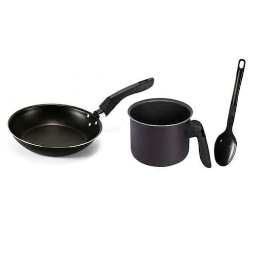 Kit frigideira e canecão fervedor leiteira antiaderente teflon com espatula cor grafite Kit fervedor e frigideira antiaderente Teflon com cabo de baquelite é ideal para facilitar o preparo de alimentos na cozinha. O fervedor ideal para ferver água leite chás de forma rápida e prática, enquanto a frigideira antiaderente permite preparar alimentos com facilidade, sem grudar no fundo.