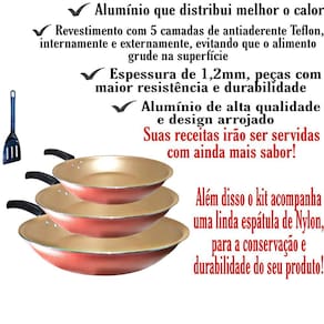 Prazer, somos a Coisas & Trecos.Nossa missão é garantir a satisfação total dos nossos clientes, entregando produtos de qualidade e excelência no atendimento.Assim estabelecendo uma relação de confiança, oferecendo a você, a melhor experiência de compra!Quer um toque especial para sua casa? Então você não pode deixar de conhecer, nossa variedade de produtos, criativos, de alta qualidade e originalidade.Para garantir sua melhor experiência, recomendamos que leia completamente a oferta e as descrições do produto pretendido, e caso tenha alguma dúvida utilize o campo de perguntas para que nossa equipe possa lhe auxiliar.Tenha a tranquilidade de comprar com quem está disposto a te oferecer, o melhor suporte e atendimento, sua confiança e satisfação valem ouro para nós. Nossa equipe de pós venda está à disposição para te auxiliar e esclarecer eventuais dúvidas.Aguardamos seu pedido!Especificações do Produto Cozinhar é a arte de misturar sabores e encantar, é na cozinha que a mágica acontece, que os amigos se reúnem, que as alegrias se multiplicam...Beleza, charme, praticidade na hora de cozinhar, você vai se encantar por esse Conjunto de Frigideira Francesa 22, 24 e 26 com espátula de nylon, sua cozinha merece esse mimo! Conjunto de Frigideiras Francesas 22, 24 e 26 Color com Espátula - Coisas & Trecos, item indispensável na sua cozinha, produzido com alumínio de alta qualidade, espessura de 1,1 mm, peças com maior resistência e durabilidade, alumínio que distribui melhor o calor, proporcionando um cozimento mais rápido e uniforme do alimento, Frigideiras revestidas com 5 camadas de antiaderente TEFLON (DuPont) - PFOA Free, internamente e externamente, evitando que o alimento grude na superfície, o que facilita no preparo dos alimentos e proporciona praticidade no momento da limpeza. Possui cabo com espaçador metálico, feito em baquelite, um material antitérmico, que não retém calor, contribuindo para um manuseio mais confortável e seguro. Além disso o conjunto acompanha uma linda espátula de Nylon, ideal para a conservação e durabilidade do seu produto! Especificações Técnicas: Dimensões aproximadas - cm: (Altura x Largura x Comprimento - Capacidade volume):- 1 Frigideira Francesa 22 cm de diâmetro - 5 x 22 x 37 – 1,1L- 1 Frigideira Francesa 24 cm de diâmetro - 5 x 24 x 39,5 – 1,3L- 1 Frigideira Francesa 26 cm de diâmetro - 5 x 26 x 41,5- Espátula Nylon Material: Alumínio RevestidoMaterial Espátula: NylonRevestimento Interno: Antiaderente Teflon Externo: Antiaderente Teflon – Cor ( a escolha da variação) Espessura Material: 1,1mmTampa: NãoAlça: BaquelitePeso Conjunto: 316 gPeso Embalagem: 145 gEmbalagem: Saco Plástico / Caixa PardaDimensões aproximadas da embalagem (AxLxP): 34 x 28 x 9 cmGarantia do fornecedor: 30 dias contra defeitos de fabricação. Cuidados:- Antes de usar pela primeira vez, lave com esponja macia, detergente neutro, depois de secar, unte a área interna com óleo e aqueça em fogo baixo por 1 minuto. Deixe esfriar é só lavar e seu produto está pronto para uso, sempre em fogo baixo ou médio (nunca superior a 350°C);- Ideal para fogão a gás, elétrico e vitrocerâmico com resistência elétrica;- Para mexer os alimentos use somente utensílios de silicone ou nylon;- Nunca use utensílios de metal ou objetos pontiagudos;- Mantenha o produto sobre a chama do fogão apenas o necessário para o cozimento;- Não exponha as alças e cabos diretamente ao fogo ou fonte de calor prolongado;- Não pode ser levada ao forno e/ou microondas;- Evite a imersão do produto quente em água fria. Sempre o deixe esfriar antes de lavar;- Para limpeza, utilize sabão ou detergente neutro e esponja macia;- Nunca utilize solventes, objetos cortantes ou abrasivos;- Para maior durabilidade do produto recomenda-se secar bem antes de guardar. Informações do Fabricante: Coisas & Trecos possui 18 anos de experiência no mercado de alumínio e utensílios para casa. A Coisas & Trecos tem como norte o desenvolvimento com estreitas e duradouras parcerias com fabricantes e fornecedores, com o objetivo de entregar aos seus clientes produtos de qualidade. Detalhes:- Com Antiaderente Teflon PFOA Free, que garante a ausência de elementos nocivos à saúde em sua composição- Ao comprar seu Conjunto de Frigideira Francesa 22, 24 e 26 Color com Espátula de Nylon, você receberá em seu endereço: 1 Frigideira Francesa 22 cm; 1 Frigideira Francesa 24 cm e 1 Frigideira Francesa 26 cm, na cor escolhida no ato da compra e uma linda: Espátula de Nylon. - Itens decorativos não acompanham o produto. Imagens meramente ilustrativas (a cor do produto pode sofrer alteração de acordo com a qualidade do monitor).- Para descarte dos produtos e embalagens siga as orientações de reciclagem vigente. Estamos à disposição para qualquer dúvida. Agradecemos a sua visita e aguardamos seu pedido!
