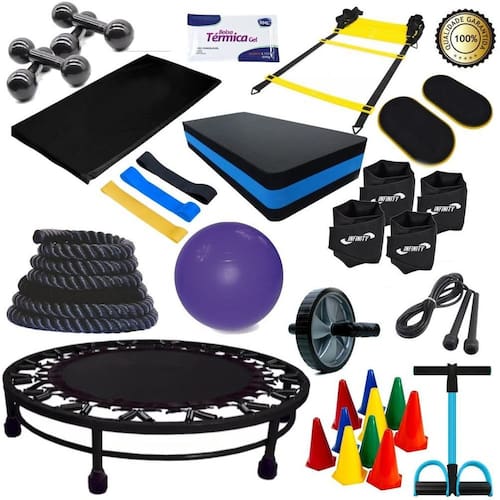 Kit funcional para treino e ginástica em casa completo Kit funcional composto por: 1 step 60x28x10 cm 1 bola suiça 65 cm 1 roda abdominal 6 cones 23 cm 1 par de caneleira 2 kg 1 par de caneleira 3 kg 1 colchonete 90x45x2 cm 1 escada de agilidade 1 corda de pular em pvc 1 extensor elastico com apoio 1 disco de deslizamento 1 kit mini band leve, médio e forte 1 bolsa térmica 1 mini jump 32 molas