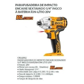 Parafusadeira de impacto encaixe sextavado 1/4 ingco à bateria íon-lítio 20v e parafusadeira e furadeiraingco 3/8 à bateria íon-lítio 20v ckli2006-9acompanha: 2 baterias 20v íon-lítio 2.0ah 1 carregador bivolt carrega bateria 20v 2.0ah em 1hcarrega bateria 20v 4.0ah em 2h Com 2 peças de chave de fenda Com 3 unidades de porcacirli2002parafusadeira de impacto encaixe sextavado 1/4 ingco à bateria íon-lítio 20v Tensão: 20v Motor sem escova bl - brushless Haste hexagonal: 1/4 Velocidade sem carga: 0-1.300 / 0-2.100 / min Taxa de impacto: 0-2.000 / 0-3.300bpm Torque máximo: 170nm Função de bloqueio do eixocdli20024parafusadeira e furadeira ingco 3/8 à bateria íon-lítio 20v Tensão: 20v Velocidade sem carga: 0-400 / 0-1.500 / min Torque máx: 45nm Capacidade do mandril: 0,8-10 mm 3/8 Configurações de torque: 15 + 1 Engrenagem mecânica de 2 velocidades Função de bloqueio do eixo Tensão de carga: 220v-240v 50 / 60hz Lanterna integrada Indicador de energia da bateria em led Embalado em bolsa de lona