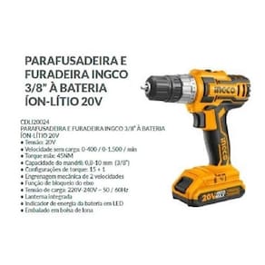 Parafusadeira de impacto encaixe sextavado 1/4 ingco à bateria íon-lítio 20v e parafusadeira e furadeiraingco 3/8 à bateria íon-lítio 20v ckli2006-9acompanha: 2 baterias 20v íon-lítio 2.0ah 1 carregador bivolt carrega bateria 20v 2.0ah em 1hcarrega bateria 20v 4.0ah em 2h Com 2 peças de chave de fenda Com 3 unidades de porcacirli2002parafusadeira de impacto encaixe sextavado 1/4 ingco à bateria íon-lítio 20v Tensão: 20v Motor sem escova bl - brushless Haste hexagonal: 1/4 Velocidade sem carga: 0-1.300 / 0-2.100 / min Taxa de impacto: 0-2.000 / 0-3.300bpm Torque máximo: 170nm Função de bloqueio do eixocdli20024parafusadeira e furadeira ingco 3/8 à bateria íon-lítio 20v Tensão: 20v Velocidade sem carga: 0-400 / 0-1.500 / min Torque máx: 45nm Capacidade do mandril: 0,8-10 mm 3/8 Configurações de torque: 15 + 1 Engrenagem mecânica de 2 velocidades Função de bloqueio do eixo Tensão de carga: 220v-240v 50 / 60hz Lanterna integrada Indicador de energia da bateria em led Embalado em bolsa de lona Marca: Não Informado