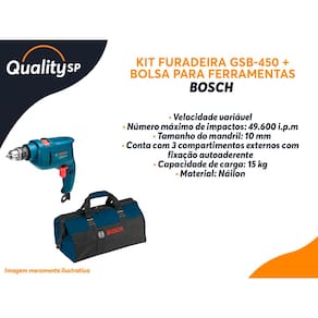 Conteúdo da embalagem: • 01 Furadeira de Impacto BOSCH GSB 450 RE STD 450W • 01 Chave Mandril • 01 Bolsa de Transporte