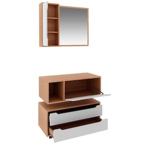 - 1 x Gabinete de Banheiro 80 cm com 1 Porta e Nicho1 x Espelheira para Banheiro 80 cm com 1 Porta1 x Balcão para Gabinete de Banheiro com 2 Gavetas e RodíziosManual de MontagemAcessórios de Montagem