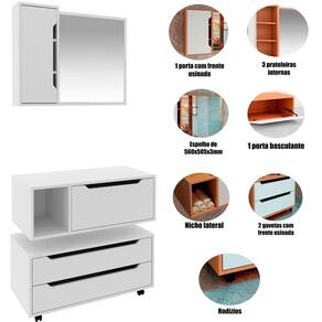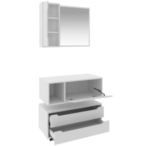 - 1 x Gabinete de Banheiro 80 cm com 1 Porta e Nicho1 x Espelheira para Banheiro 80 cm com 1 Porta1 x Balcão para Gabinete de Banheiro com 2 Gavetas e RodíziosManual de MontagemAcessórios de Montagem