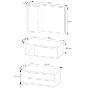 • Largura: Gabinete: 80 cm/Espelheira: 80 cm/Balcão: 80 cm/Cuba: 40 cm