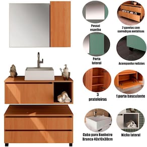 • Material: Gabinete/Balcão e Espelheira: Estrutura em MDP / Cuba: Mármore sintético