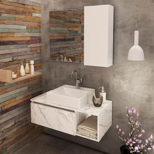 O Kit para Banheiro é a escolha ideal para transformar o seu espaço em um ambiente elegante e organizado. Com um design atual, ele oferece não apenas beleza, mas também funcionalidade, contribuindo para um banheiro agradável e útil. Produzido com materiais de alta qualidade, o kit garante durabilidade e resistência, criando um ambiente harmonioso e agradável para o seu dia a dia. CARACTERÍSTICAS TÉCNICAS: - Produzida em MDP de 15 mm - Acabamento UV na cor Branco e Mármore Branco - Acompanha Espelho - Cuba em Mármore Sintético - Porta Basculante com Dobradiça e Articulador - Balcão Suspenso - Puxador tipo Cava *Kit Composto por Gabinete Suspenso (3601), Espelheira (3602) e Cuba (3630) INFORMAÇÕES TÉCNICAS: 3601: Alt. 26,5 x Larg. 80 x Prof. 38,7 cm P. 10,8 kg 3602: Alt. 60 x Larg. 80 x Prof. 17 cm P. 12 kg 3630: Alt. 11,5 x Larg. 35 x Prof. 34 cm P. 5,5 kg INFORMAÇÕES ADICIONAIS: - ATENÇÃO: Não trabalhamos e não nos responsabilizamos pela montagem do móvel. Antes da montagem conferir se o produto está de acordo com o que comprou, produto montado e danificado pela montagem não será aceito troca. Montagem e instalação por conta do comprador. - As imagens ambientadas são meramente ilustrativas e podem apresentar itens que não compõe o produto. As cores do produto podem variar de acordo com o monitor, a iluminação do ambiente ou sua percepção visual. - Limpeza: Deve ser feita com pano macio e seco ou levemente. Não devem ser utilizados abrasivos como palha de aço e objetos cortantes. Garantia para defeitos de fabricação conforme Código de Defesa do Consumidor.