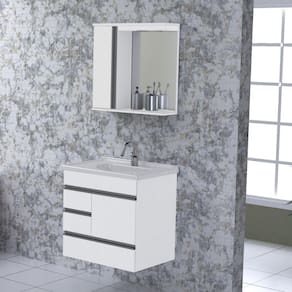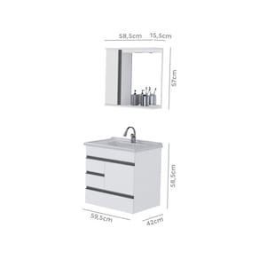 Possui uma composição integrada entre armário, espelheira e pia com design clean em linhas retas específico para o conjunto. suas portas e gavetas em bp madeirado, com cores da tendência, compõem um conjunto de armário, pia e espelheira. puxadores perfil em alumínio, corrediças e dobradiças de metal reforçado , lâmpadas de led bivolt, que proporcionam iluminação uniforme no espelho, tornam o conjunto sofisticado e bonito. Acabamento da Cuba: Esmaltado Acabamento da Gaveta: BP Acabamento da Porta: BP Acabamento da Prateleira: BP Acompanha Cuba: Sim Acompanha Lâmpada: 01 Acompanha Tampo: Sim Ambiente Principal: Banheiro codigo_ean: 7908506247055 Complexidade da Montagem: Baixa: pode ser montado por uma pessoa sozinha Cor: Branco Texturizado Cor do Produto: Branco Texturizado Cor Interna: Branco Escala de Brilho: Semi-Fosco Escala de Brilho da Gaveta: Semi-Fosco Escala de Brilho da Porta: Semi-Fosco Escala de Brilho da Prateleira: Semi-Fosco Espessura do Espelho: 13 mm Formato do Espelho: Quadrado Furação para Cuba e Torneira: Sim Gaveta com Chave: Não Itens Inclusos: 1 Kit, Kit Ferragens e Manual de Montagem Linha ou Coleção: Modena Manual de Montagem e Instalação: https://product-hub-prd.madeiramadeira.com.br/654837/documents/242836a2-2b8a-4db7-bdc5-a3bafda5988771925mdena5578frenteeverso.pdf Material da Cuba: Mármore Sintético Material da Gaveta: MDF/MDP Material da Porta: MDP Material da Prateleira: MDF/MDP Material do Tampo: Mármore Material Principal: MDP Medida da Cuba (C x L x P): 83x45x15,5cm Medida da Espelheira (A x L x P): 57x58,5x15,5cm Medida do Gabinete (A x L x P): 58,5x59,5x42cm Necessita Montagem: Sim Origem do Produto: Nacional Peso: 38,23 kg Peso Máximo por Gaveta: 200 kg Peso Máximo por Prateleira: 0,2 kg Possui Espelheira: Sim Possui Gabinete: Sim Possui iluminação: Sim Possui Pés: Suspenso Possui Rodízio: Não Produto Montado: Sim Recomendações de Uso, Manutenção e Limpeza: Nunca utilize esponja tipo bombril para a limpeza de seu armário e pia e nem produtos abrasivos, para limpeza utilize uma flanela limpa e seca. A exposição a luz solar pode modificar a cor único do produto. Sistema de Montagem: Parafusos Tamanho do Espelho (A x L): 57x58,5cm Tipo de Corrediça da Gaveta: Metálica Simples Tipo de Dobradiça/Corrediça da Porta: Metálica Tipo de Porta: Bater Tipo de Puxador da Gaveta: Embutido Tipo de Puxador da Porta: Embutido