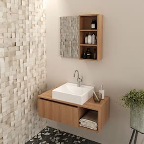 O Kit para Banheiro é a escolha ideal para transformar o seu espaço em um ambiente elegante e organizado. Com um design atual, ele oferece não apenas beleza, mas também funcionalidade, contribuindo para um banheiro agradável e útil. Produzido com materiais de alta qualidade, o kit garante durabilidade e resistência, criando um ambiente harmonioso e agradável para o seu dia a dia. CARACTERÍSTICAS TÉCNICAS: - Produzida em MDP de 15 mm - Acabamento UV na cor Amendôa - Acompanha Espelho - Cuba em Mármore Sintético - Porta Basculante com Dobradiça e Articulador - Balcão Suspenso - Puxador tipo Cava *Kit Composto por Gabinete Suspenso (3601), Espelheira (3609) e Cuba (3630) INFORMAÇÕES TÉCNICAS: 3601: Alt. 26,5 x Larg. 80 x Prof. 38,7 cm P. 10,8 kg 3609: Alt. 54 cm x Larg. 60 cm x Prof. 15,6 x P. 7,65 kg 3630: Alt. 11,5 x Larg. 35 x Prof. 34 cm P. 5,5 kg INFORMAÇÕES ADICIONAIS: - ATENÇÃO: Não trabalhamos e não nos responsabilizamos pela montagem do móvel. Antes da montagem conferir se o produto está de acordo com o que comprou, produto montado e danificado pela montagem não será aceito troca. Montagem e instalação por conta do comprador. - As imagens ambientadas são meramente ilustrativas e podem apresentar itens que não compõe o produto. As cores do produto podem variar de acordo com o monitor, a iluminação do ambiente ou sua percepção visual. - Limpeza: Deve ser feita com pano macio e seco ou levemente. Não devem ser utilizados abrasivos como palha de aço e objetos cortantes. Garantia para defeitos de fabricação conforme Código de Defesa do Consumidor.