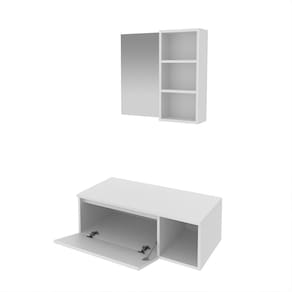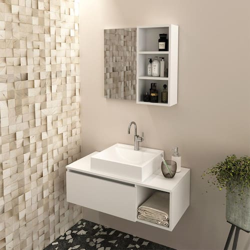 O Kit para Banheiro é a escolha ideal para transformar o seu espaço em um ambiente elegante e organizado. Com um design atual, ele oferece não apenas beleza, mas também funcionalidade, contribuindo para um banheiro agradável e útil. Produzido com materiais de alta qualidade, o kit garante durabilidade e resistência, criando um ambiente harmonioso e agradável para o seu dia a dia. CARACTERÍSTICAS TÉCNICAS: - Produzida em MDP de 15 mm - Acabamento UV na cor Branco - Acompanha Espelho - Cuba em Mármore Sintético - Porta Basculante com Dobradiça e Articulador - Balcão Suspenso - Puxador tipo Cava *Kit Composto por Gabinete Suspenso (3601), Espelheira (3609) e Cuba (3630) INFORMAÇÕES TÉCNICAS: 3601: Alt. 26,5 x Larg. 80 x Prof. 38,7 cm P. 10,8 kg 3609: Alt. 54 cm x Larg. 60 cm x Prof. 15,6 x P. 7,65 kg 3630: Alt. 11,5 x Larg. 35 x Prof. 34 cm P. 5,5 kg INFORMAÇÕES ADICIONAIS: - ATENÇÃO: Não trabalhamos e não nos responsabilizamos pela montagem do móvel. Antes da montagem conferir se o produto está de acordo com o que comprou, produto montado e danificado pela montagem não será aceito troca. Montagem e instalação por conta do comprador. - As imagens ambientadas são meramente ilustrativas e podem apresentar itens que não compõe o produto. As cores do produto podem variar de acordo com o monitor, a iluminação do ambiente ou sua percepção visual. - Limpeza: Deve ser feita com pano macio e seco ou levemente. Não devem ser utilizados abrasivos como palha de aço e objetos cortantes. Garantia para defeitos de fabricação conforme Código de Defesa do Consumidor.