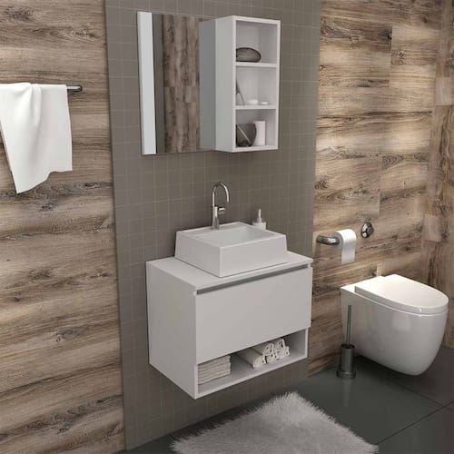 O Kit para Banheiro é a escolha ideal para transformar o seu espaço em um ambiente elegante e organizado. Com um design atual, ele oferece não apenas beleza, mas também funcionalidade, contribuindo para um banheiro agradável e útil. Produzido com materiais de alta qualidade, o kit garante durabilidade e resistência, criando um ambiente harmonioso e agradável para o seu dia a dia. CARACTERÍSTICAS TÉCNICAS: - Produzida em MDP de 15 mm - Acabamento UV na cor Branco - Cuba em Mármore Sintético - Acompanha Espelho - Porta Basculante com Articulador e Dobradiças Metálicas - Puxador tipo Cava - Balcão Suspenso *Kit Composto por Gabinete Suspenso (3606), Espelheira (3609) e Cuba (3630) INFORMAÇÕES TÉCNICAS: 3606: Alt. 46,5 cm x Larg. 60 cm x Prof. 38,7 cm x P. 12 kg 3609: Alt. 54 cm x Larg. 60 cm x Prof. 15,6 x P. 7,65 kg 3630: Alt. 11,5 x Larg. 35 x Prof. 34 cm P. 5,5 kg INFORMAÇÕES ADICIONAIS: - ATENÇÃO: Não trabalhamos e não nos responsabilizamos pela montagem do móvel. Antes da montagem conferir se o produto está de acordo com o que comprou, produto montado e danificado pela montagem não será aceito troca. Montagem e instalação por conta do comprador. - As imagens ambientadas são meramente ilustrativas e podem apresentar itens que não compõe o produto. As cores do produto podem variar de acordo com o monitor, a iluminação do ambiente ou sua percepção visual. - Limpeza: Deve ser feita com pano macio e seco ou levemente. Não devem ser utilizados abrasivos como palha de aço e objetos cortantes. Garantia para defeitos de fabricação conforme Código de Defesa do Consumidor.