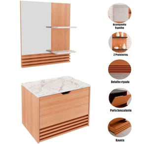 O Kit Gabinete e Espelheira de Banheiro 60 cm Sâmia é a escolha ideal para quem deseja unir estilo e praticidade no ambiente. Com estrutura em mdp de alta qualidade, o gabinete possui acabamento em BP e detalhes em pintura UV, o que garante maior durabilidade e resistência à umidade. Seu design com ripado frontal traz um toque contemporâneo que valoriza qualquer decoração de banheiro.