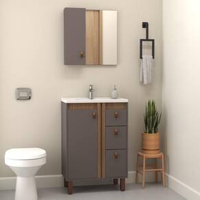 Kit Gabinete E Espelho Para Banheiro Ariel 60 Cm Com Pé Havana/jequitibá Conjunto Gabinete para Banheiro Ariel 60 cm Havana/Jequitibá - Gabinete de Banheiro Ariel com Cuba em Marmorite Moderno, Resistente e Funcional