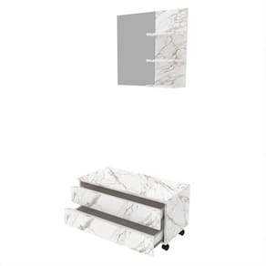 >CARACTERÍSTICAS TÉCNICAS: - Produzida em MDP de 15 mm - Acabamento UV na cor Mármore Branco - Acompanha Espelho - 2 Gavetas com Corrediças Metálicas - Puxador tipo Cava - Balcão com Rodízios *Cuba NÃO incluso, apenas demonstrativo *Kit Composto por Gabinete com Rodízios (3601) e Espelheira (3608)