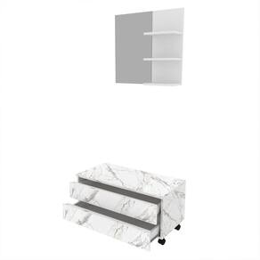 CARACTERÍSTICAS TÉCNICAS: - Produzida em MDP de 15 mm - Acabamento UV na cor Mármore Branco e Branco - Acompanha Espelho - 2 Gavetas com Corrediças Metálicas - Puxador tipo Cava - Balcão com Rodízios *Cuba NÃO incluso, apenas demonstrativo *Kit Composto por Gabinete com Rodízios (3601) e Espelheira (3608)