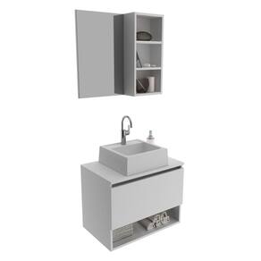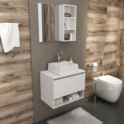 O Kit para Banheiro é a escolha ideal para transformar o seu espaço em um ambiente elegante e organizado. Com um design atual, ele oferece não apenas beleza, mas também funcionalidade, contribuindo para um banheiro agradável e útil. Produzido com materiais de alta qualidade, o kit garante durabilidade e resistência, criando um ambiente harmonioso e agradável para o seu dia a dia. CARACTERÍSTICAS TÉCNICAS: - Produzida em MDP de 15 mm - Acabamento UV na cor Branco - Acompanha Espelho - Cuba em Mármore Sintético - Balcão Suspenso - Porta Basculante com Dobradiça Metálica - Gaveta com Corrediça Metálica - Puxador tipo Cava - Possui 1 Prateleira *Kit Composto por Gabinete Suspenso (3606), Espelheira (3609) e Cuba (3630) INFORMAÇÕES TÉCNICAS: 3606: Alt. 46,5 cm x Larg. 60 cm x Prof. 38,7 cm x P. 12 kg 3609: Alt. 54 cm x Larg. 60 cm x Prof. 15,6 x P. 7,65 kg 3630: Alt. 11,5 x Larg. 35 x Prof. 34 cm P. 5,5 kg INFORMAÇÕES ADICIONAIS: - ATENÇÃO: Não trabalhamos e não nos responsabilizamos pela montagem do móvel. Antes da montagem conferir se o produto está de acordo com o que comprou, produto montado e danificado pela montagem não será aceito troca. Montagem e instalação por conta do comprador. - As imagens ambientadas são meramente ilustrativas e podem apresentar itens que não compõe o produto. As cores do produto podem variar de acordo com o monitor, a iluminação do ambiente ou sua percepção visual. - Limpeza: Deve ser feita com pano macio e seco ou levemente. Não devem ser utilizados abrasivos como palha de aço e objetos cortantes. Garantia para defeitos de fabricação conforme Código de Defesa do Consumidor.