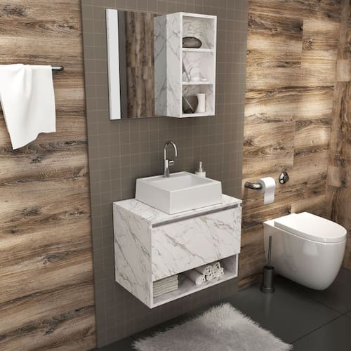 O Kit para Banheiro é a escolha ideal para transformar o seu espaço em um ambiente elegante e organizado. Com um design atual, ele oferece não apenas beleza, mas também funcionalidade, contribuindo para um banheiro agradável e útil. Produzido com materiais de alta qualidade, o kit garante durabilidade e resistência, criando um ambiente harmonioso e agradável para o seu dia a dia. CARACTERÍSTICAS TÉCNICAS: - Produzida em MDP de 15 mm - Acabamento UV na cor Mármore Branco - Acompanha Espelho - Cuba em Mármore Sintético - Balcão Suspenso - Porta Basculante com Dobradiça Metálica - Gaveta com Corrediça Metálica - Puxador tipo Cava - Possui 1 Prateleira *Kit Composto por Gabinete Suspenso (3606), Espelheira (3609) e Cuba (3630) INFORMAÇÕES TÉCNICAS: 3606: Alt. 46,5 cm x Larg. 60 cm x Prof. 38,7 cm x P. 12 kg 3609: Alt. 54 cm x Larg. 60 cm x Prof. 15,6 x P. 7,65 kg 3630: Alt. 11,5 x Larg. 35 x Prof. 34 cm P. 5,5 kg INFORMAÇÕES ADICIONAIS: - ATENÇÃO: Não trabalhamos e não nos responsabilizamos pela montagem do móvel. Antes da montagem conferir se o produto está de acordo com o que comprou, produto montado e danificado pela montagem não será aceito troca. Montagem e instalação por conta do comprador. - As imagens ambientadas são meramente ilustrativas e podem apresentar itens que não compõe o produto. As cores do produto podem variar de acordo com o monitor, a iluminação do ambiente ou sua percepção visual. - Limpeza: Deve ser feita com pano macio e seco ou levemente. Não devem ser utilizados abrasivos como palha de aço e objetos cortantes. Garantia para defeitos de fabricação conforme Código de Defesa do Consumidor.