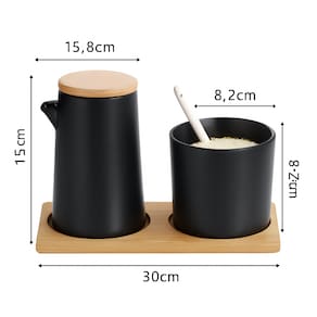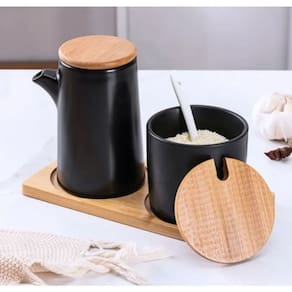 Conjunto para armazenamento de condimentos composto por dois recipientes em cerâmica na cor preta e acessórios em bambu. O item inclui um galheteiro com bico dosador e tampa, um pote circular com tampa vazada para colher, uma colher de cerâmica e uma bandeja de suporte em bambu com encaixes circulares. Indicado para armazenamento de azeite, vinagre, sal, açúcar ou farinhas. A cerâmica possui acabamento liso e as tampas vedação simples por sobreposição.