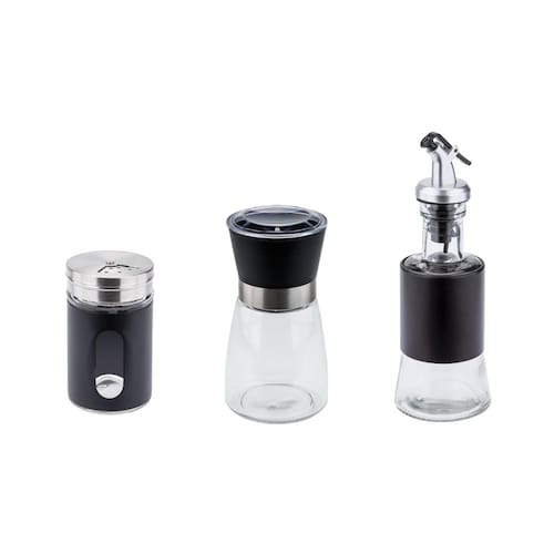 Itens incluso: 6259 - Moedor de sal/pimenta 13cm - Vidro e Inox; 6285 - Porta condimentos 8cm - Vidro e Inox; 6286 - Galheteiro 200ml 18cm - Vidro e Inox.