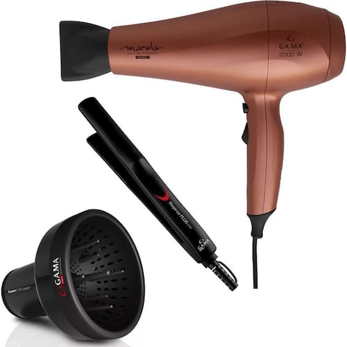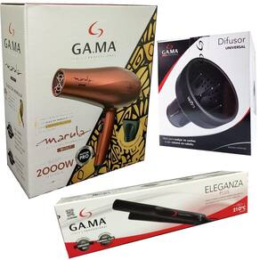 SECADOR DE CABELO GAMA MARULA CERAMIC ION 2000W - BIVOLTMuito mais brilho e restauração para o seu cabelo!A grade frontal do secador Marula Ceramic Ion é feita com a exclusiva tecnologia Essential Oil, ativada com o calor do produto, que nesta versão traz o óleo de Marula: o óleo provém da cultura da semente de camélia desidratada que possui poderosas propriedades antioxidantes e protetoras que evitam danos nos cabelos naturais e quimicamente coloridos, ajudando a manter a hidratação e reduzir a aparência de pontas duplas.O secador Marula Ceramic Ion tabém possui a tecnologia Antifrizz que é produzida pela alta emissão de íons negativos, responsável por manter a umidade natural dos fios ao mesmo tempo em que fecha a cutícula capilar; resultando em cabelos mais saudáveis, sedosos e com menos frizz.Seu motor é profissional, para maior desempenho e durabilidade, com 2.000W de potência, um fluxo de ar impressionante, 2 velocidades, 3 níveis de temperatura e botão de jato de ar frio.Além de todos esses benefícios, ele é um produto BIVOLT com acionamento automático nas tensões 127V e 220V, o que traz muito mais praticidade para o seu dia a dia e viagens.Óleos essenciais, brilho e proteção para todos os cabelos!2.000W De PotênciaMarula Active Oil TecnologyMotor Ac Profissional - Maior Desempenho E DurabilidadeInclui Bico Direcionador De ArMais Versatilidade: 2 Velocidades E 3 TemperaturasBotão Jato De Ar Frio: Cabelos Com Mais Brilho E Menos FrizzGrade Frontal Revestida Com Óleo De Marula Para Uma Experiência Única De SecagemAntifrizz - Seu Cabelo Com Muito Mais Brilho, Maciez E Com Menos Frizz.Oleo De Marula - A Perfeita Combinação De Ácido Graxos E Antioxidantes Para Um Cabelo Protegido E Com Acabamento AcetinadoCHAPINHA PRANCHA ALISADORA GAMA ELEGANZA PLUS 210ºC - BIVOLTCom potente resistência de cerâmica, a prancha Eleganza Plus oferece emissão de íons, que selam as cutículas do cabelo, mantendo a umidade natural dos fios, deixando-os muito mais brilhantes e sedosos, longe do temido efeito frizz. Além do mais, seu design arrojado facilita a modelagem de cachos e ondas, além do liso perfeito.Modelo: Eleganza PlusCor: PretoPotência: 34 - 37WConsumo: 0,04 kw/hTemperatura: Até 210 °CCabo: 1,8 metrosVoltagem: Bivolt AutomáticoCabo: FlexívelPeso: 0,241 kgDimensões (L x A x C): 2,5 x 4 x 24,5 cmDIFUSOR DE AR UNIVERSAL GAMA O Difusor Universal é compatível com todos os tipos de secadores. Tem como função garantir fios com volume e forma na hora da secagem. É revestido com a tecnologia Thermal Plus, ou seja, o calor não é transferido para toda sua extensão. A peça permite, ainda, distribuição homogênea do ar, para uma secagem perfeita.Dimensões do produto - 15 x 17,5 x 15Cor - PretoPeso do produto (kg) - 0,315