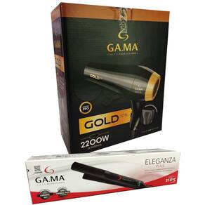 SECADOR DE CABELO GAMA GOLD ION 2200W - 127VMuito mais brilho e reconstrução para o seu cabelo!A grade frontal do secador Gold Ion é feita com a exclusiva tecnologia Essential Oil, ativada com o calor do produto, que nesta versão traz o óleo de Argan, muito conhecido como o ouro líquido entre os profissionais cabeleireiros: é rico em ácidos graxos, ômega 9 e VITAMINA E, sendo assim um antioxidante poderoso, que promove hidratação e nutrição profunda para os fios, combate o envelhecimento e protege dos efeitos negativos do calor.Já a tecnologia Antifrizz que também está presente no secador Gold Ion, é produzida pela alta emissão de íons negativos, responsável por manter a umidade natural dos fios ao mesmo tempo em que fecha a cutícula capilar; resultando em cabelos mais saudáveis, sedosos e com menos frizz.O secador possui motor profissional, para maior desempenho e durabilidade, 2.200W de potência, um fluxo de ar impressionante, 2 velocidades, 6 combinações de temperatura e botão de jato de ar frio.Óleos essenciais, brilho e proteção para todos os cabelos!Grade Frontal Revestida Com Óleo De Argan Para Uma Experiência Única De SecagemInclui Bico Direcionador De ArMotor Ac Profissional - Maior Desempenho E DurabilidadeMais Versatilidade: 2 Velocidades E 6 Combinações De TemperaturasBotão Jato De Ar Frio: Cabelo Com Mais Brilho E Menos FrizzAntifrizz - Seu Cabelo Com Muito Mais Brilho, Maciez E Com Menos Frizz.Óleo De Argan: A Perfeita Combinação De Omega 3 E Outros Ácidos Graxos Para Um Cabelo Hidratado E Nutrido.CHAPINHA PRANCHA ALISADORA GAMA ELEGANZA PLUS CERAMIC ION 210ºC - BIVOLTCom potente resistência de cerâmica, a prancha Eleganza Plus oferece emissão de íons, que selam as cutículas do cabelo, mantendo a umidade natural dos fios, deixando-os muito mais brilhantes e sedosos, longe do temido efeito frizz. Além do mais, seu design arrojado facilita a modelagem de cachos e ondas, além do liso perfeito.Modelo: Eleganza PlusCor: PretoPotência: 34 - 37WConsumo: 0,04 kw/hTemperatura: Até 210 °CCabo: 1,8 metrosVoltagem: Bivolt AutomáticoCabo: FlexívelPeso: 0,241 kgDimensões (L x A x C): 2,5 x 4 x 24,5 cm
