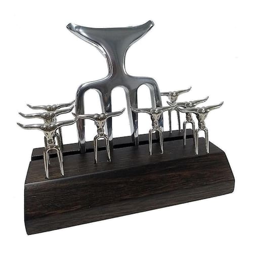 Kit Garfo para Churrasco 4 Pontas Alumínio com 8 Mini GarfosPara quem curte um bom churrasco, o Garfo 4 pontas uma ótima opção para dar mais suporte ao cortar sua carne e facilitar o seu churrasco, além de dar mais sofisticação ao churrasqueiro. É o acessório perfeito para você ter mais firmeza na hora de cortar as carnes, já que seus dentes seguram a peça e evitam que ela escape ou escorregue. E junto com os nossos Mini garfinhos para petiscos que substituem os frágeis palitos de madeira você irá elevar o nível do seu churrascoMedidas do garfo 4 pontas:Altura: 15 cmLargura: 9,5 cmMaterial: alumínio polidoMedidas dos mini garfos:Altura: 6,5 cmLargura: 5 cmMaterial: alumínio polidoAcompanha base de madeira: 18 cm x 8 cm x 3 cm aproximadamente